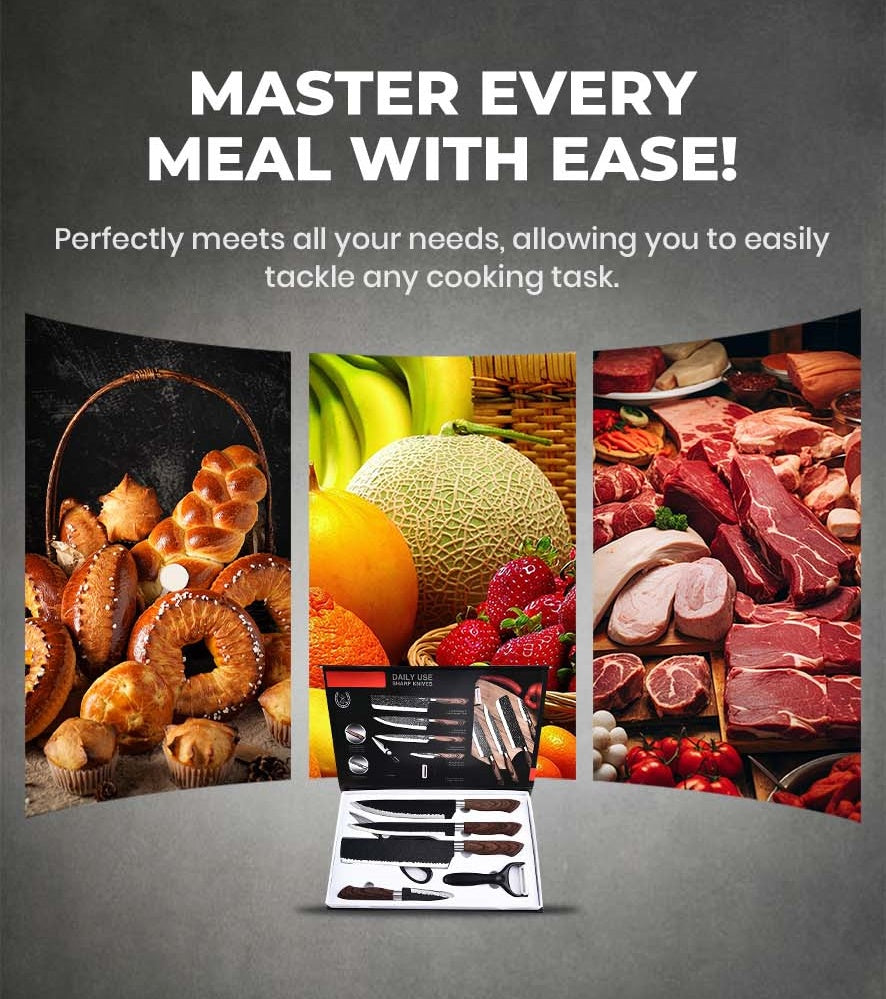 6-osaline komplekt - See põhjalik kööginoa komplekt sisaldab kokanuga, lihanuga, koorimisnuga, universaalnuga, köögikääre ja koorijat. See sobib ideaalselt kõigi teie kulinaarsete vajaduste jaoks ja varustab teid hõlpsalt iga toiduvalmistamisülesandega.
