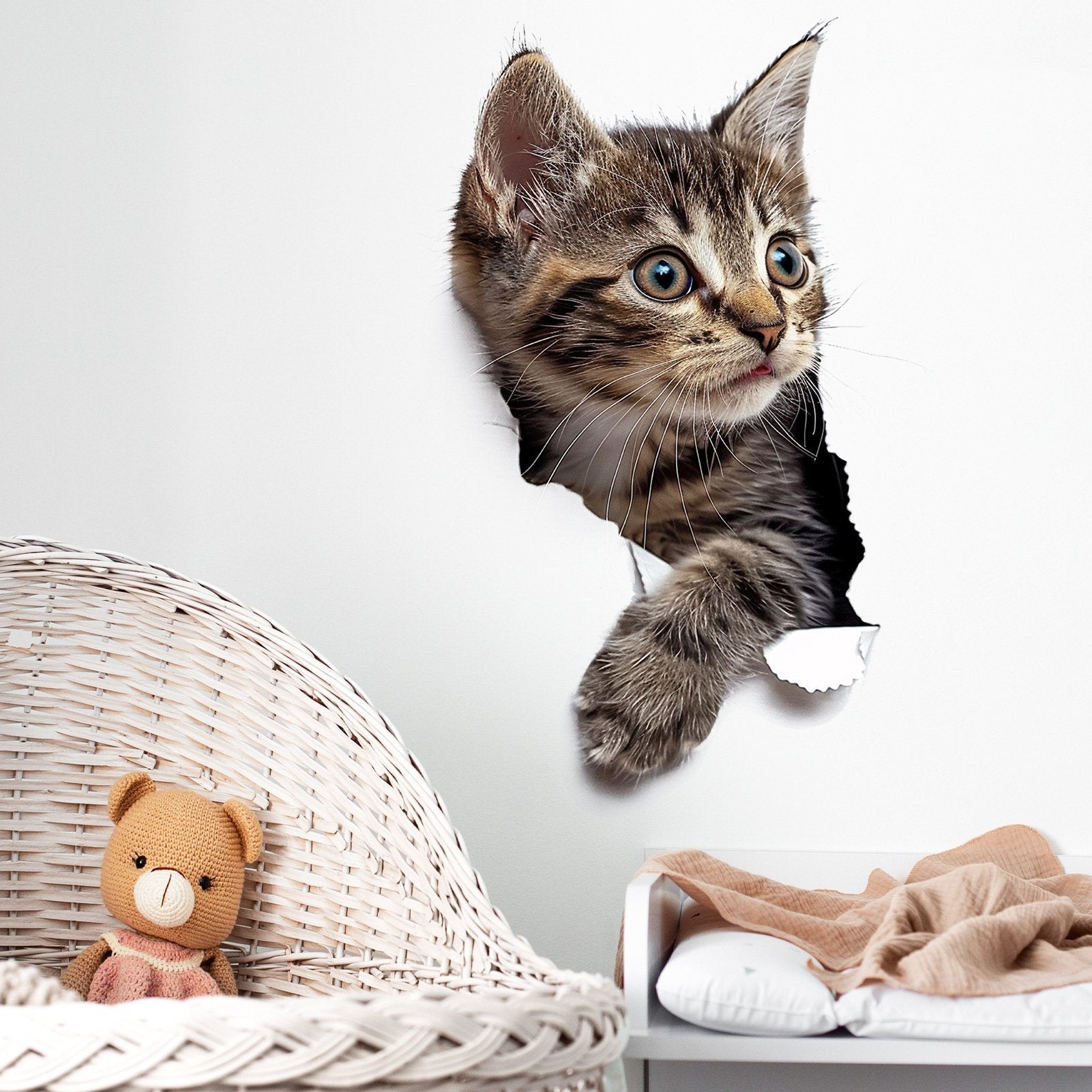 This is not just a flat sticker; it is an eye catching piece of art. The clever design creates a fun 3D illusion of Santa peeking right into your room.