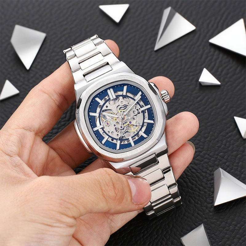 DIZAJN BROJČANIKA U FORMULI SKELET – Ovaj sat ima sofisticirani skeletonski brojčanik koji omogućuje jasan pogled na zamršenu unutarnju mehaniku za profinjen i tehnički izgled. Izloženi zupčanici stvaraju vizualnu dubinu i osjećaj izrade, što ga čini izvanrednim dodatkom za profesionalne i ležerne situacije.